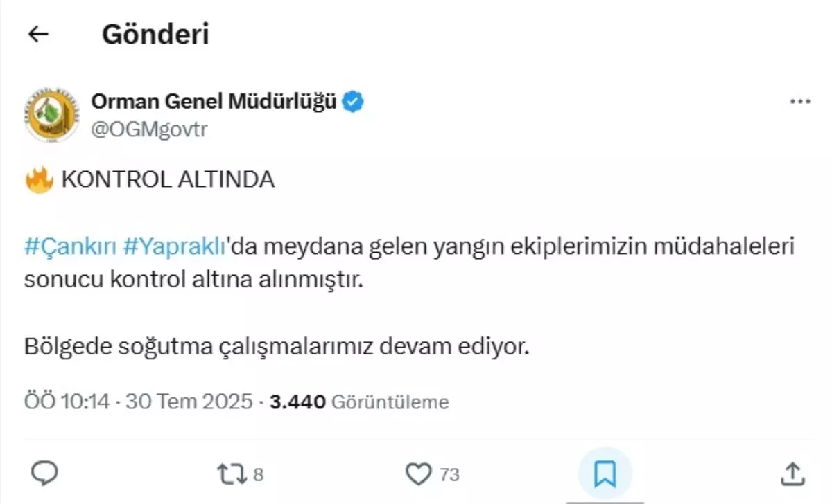 ORMAN Genel Müdürlüğü (OGM), dün Çankırı’nın Yapraklı ilçesinde çıkan orman yangının denetim altına alındığını açıkladı.