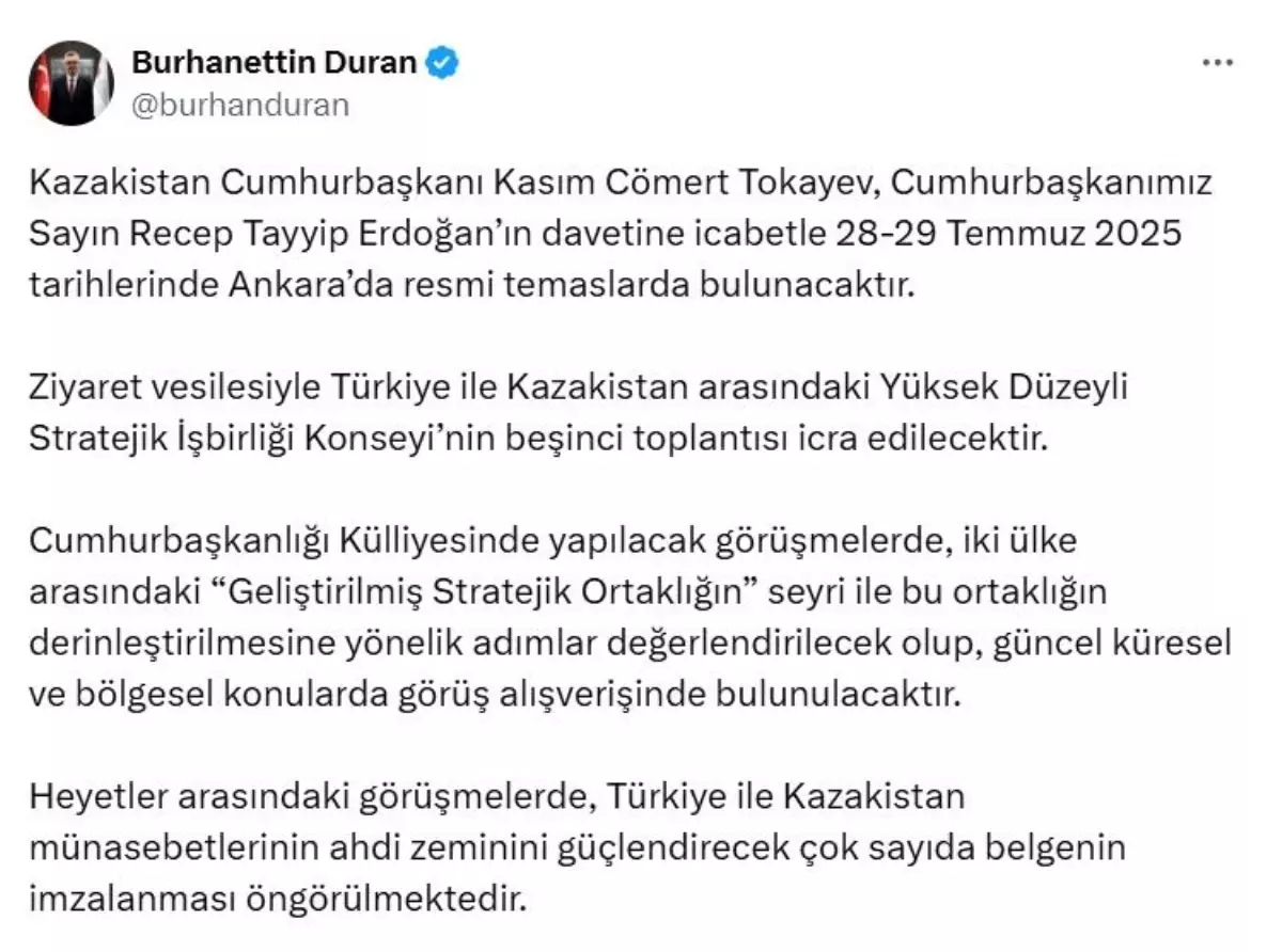 Duran, toplumsal medya hesabından yaptığı paylaşımda Kazakistan Cumhurbaşkanı Kasım Cömert Tokayev’in Türkiye‘ye geleceğini duyurdu. Duran paylaşımında, “Kazakistan Cumhurbaşkanı Kasım Cömert Tokayev, Cumhurbaşkanımız Sayın Recep Tayyip Erdoğan’ın davetine icabetle 28-29 Temmuz 2025 tarihlerinde Ankara’da resmi temaslarda bulunacaktır. Ziyaret vesilesiyle Türkiye ile Kazakistan ortasındaki Yüksek Seviyeli Stratejik İşbirliği Kurulu’nun beşinci toplantısı icra edilecektir” dedi.
