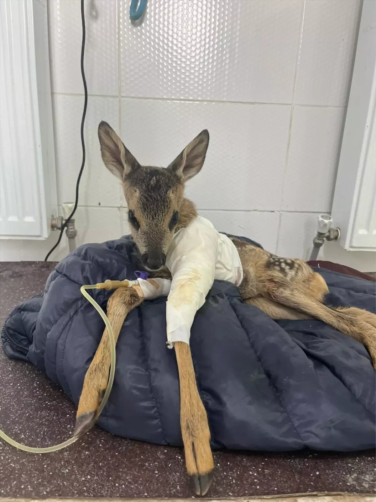 Veteriner doktor tarafından yapılan muayenede, karacanın ön bacağında kırık ve bedeninde çarpmaya bağlı çeşitli yaralanmalar tespit edildi.