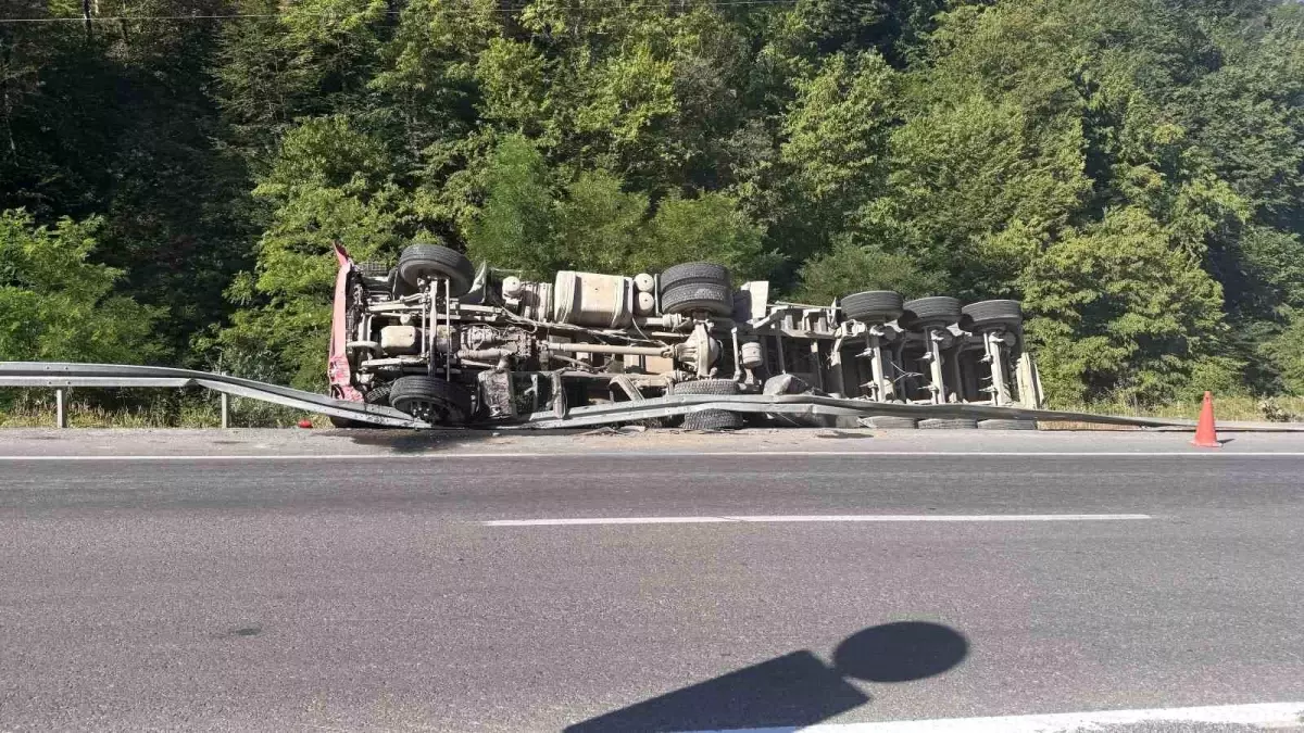 Zonguldak’ta denetimden çıkarak devrilen tırın şoförü kazayı yara almadan atlattı.